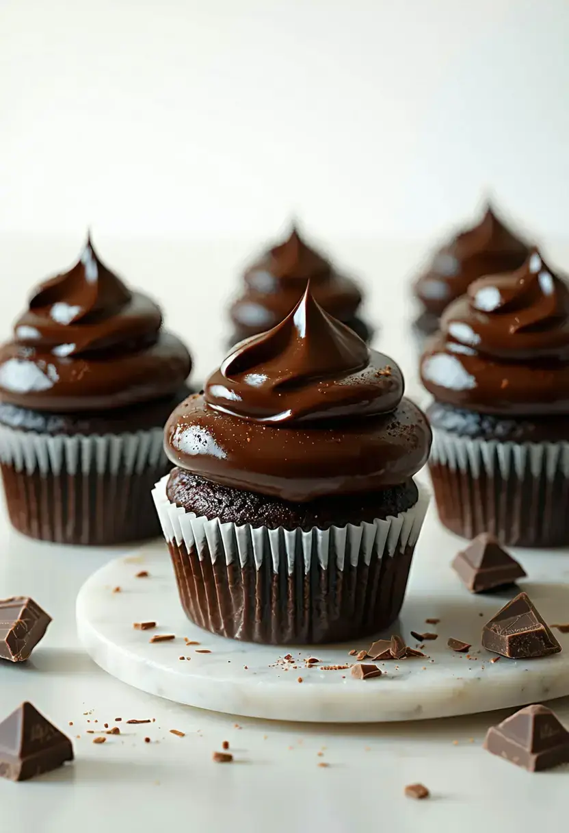 Deliciosos e úmidos cupcakes de chocolate amargo, perfeitos para qualquer amante de chocolate. Esses cupcakes são cobertos com uma suave ganache de chocolate.