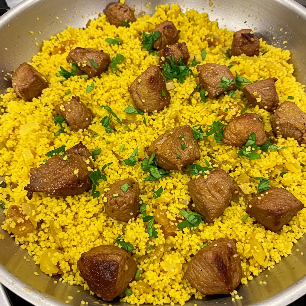 Adicione a carne moída com um pouco de seu caldo sobre o cuscuz.