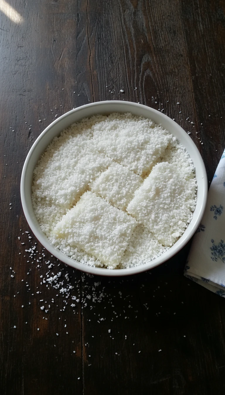 Cuscuz Cremoso de Coco: 100% vegetal, um deleite cremoso e perfumado com ingredientes naturais, perfeito para um café da manhã consciente e saboroso. Sustentabilidade e sabor em cada garfada.
