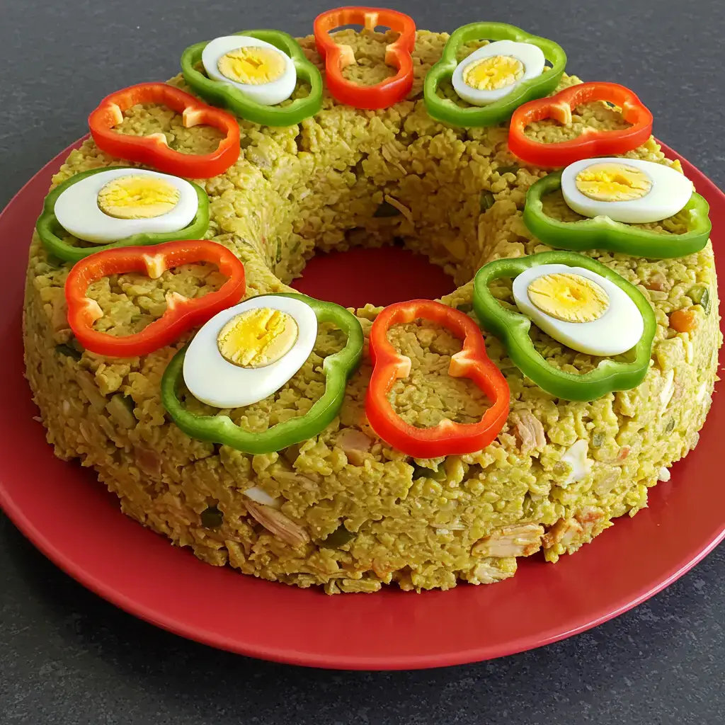Decore o fundo da forma com rodelas de ovo cozido, azeitonas inteiras, rodelas de tomate e pimentões.