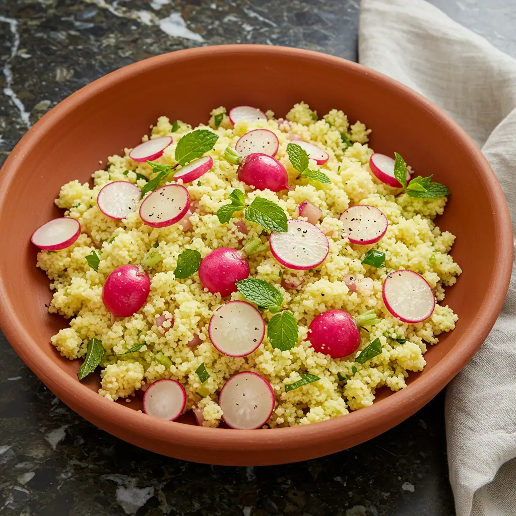 Um prato leve e saboroso, perfeito para um almoço rápido e refrescante. O cuscuz marroquino macio contrasta com o rabanete grelhado crocante, enquanto a hortelã fresca adiciona um toque aromático.