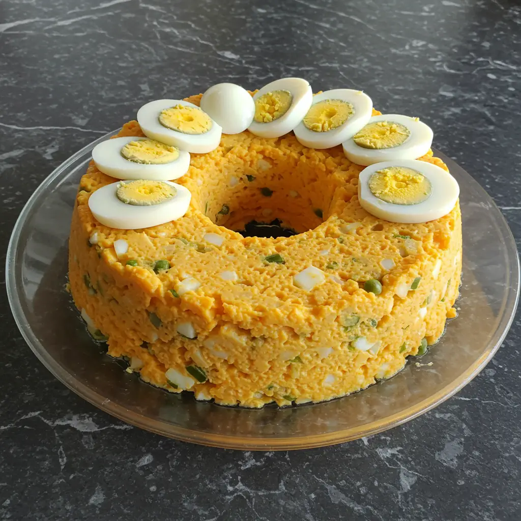Disponha as rodelas de ovos e tomate na forma, para decorar.