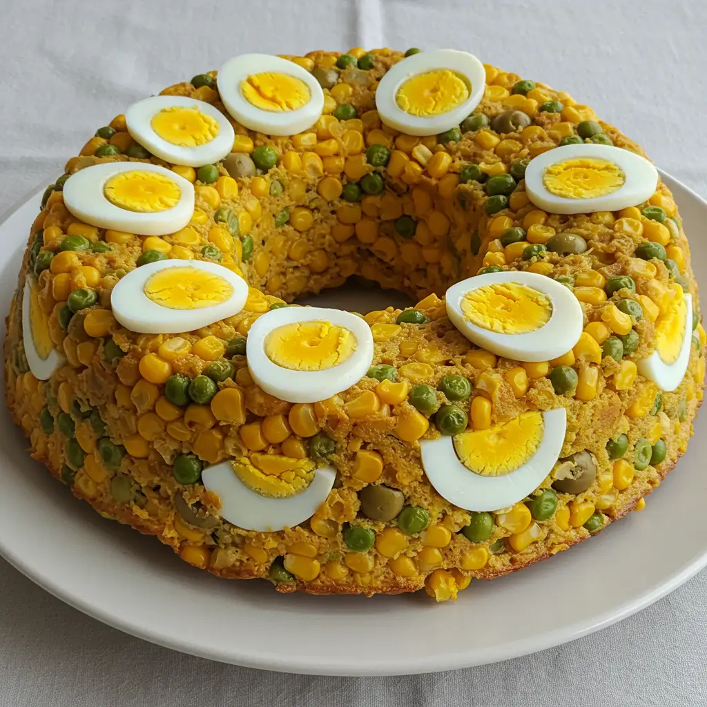 Unte uma forma redonda apenas com óleo. No fundo, disponha rodelas dos ovos cozidos restantes, além do milho e da ervilha.