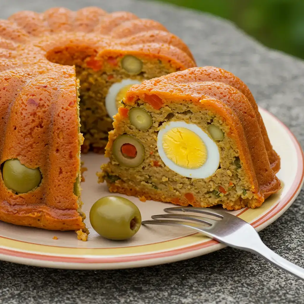 Despeje a massa em uma forma com furo central, decorando com as fatias de ovos cozidos, azeitonas e sardinhas.