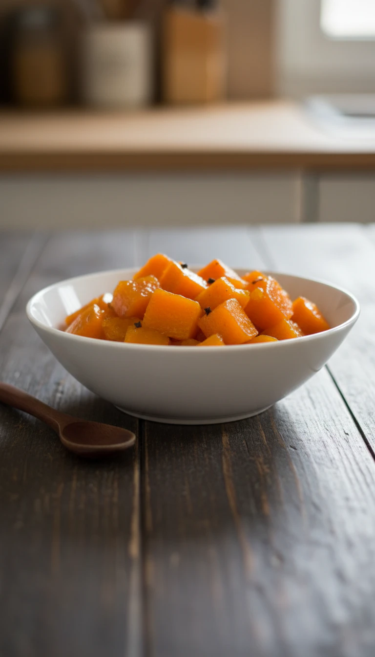 Transfira os pedaços de abóbora cozidos para uma compoteira ou recipiente bonito.