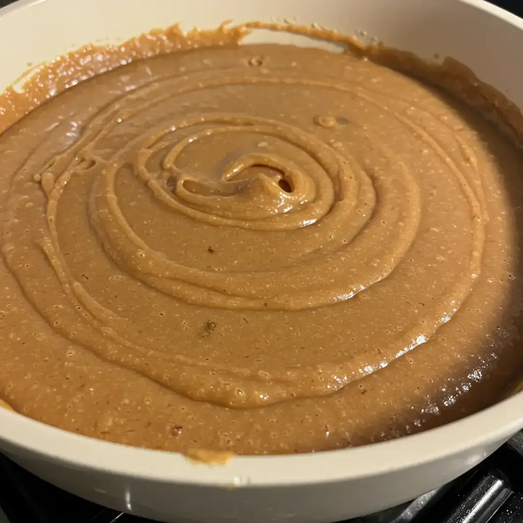 Reduza o fogo para baixo e continue cozinhando lentamente, mexendo sem parar, até o doce desgrudar do fundo da panela e apresentar uma consistência semelhante à de um doce de amendoim.