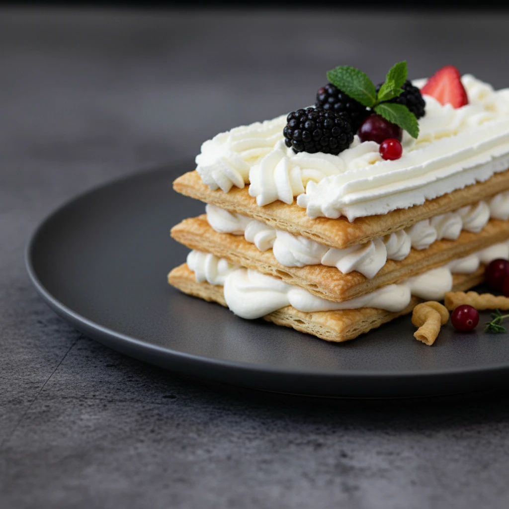 Um doce brasileiro irresistível! Camadas de massa de pastel crocante e um creme cremoso de leite condensado, finalizado com chantilly e frutas vermelhas. Uma sobremesa perfeita para encantar seus convidados.