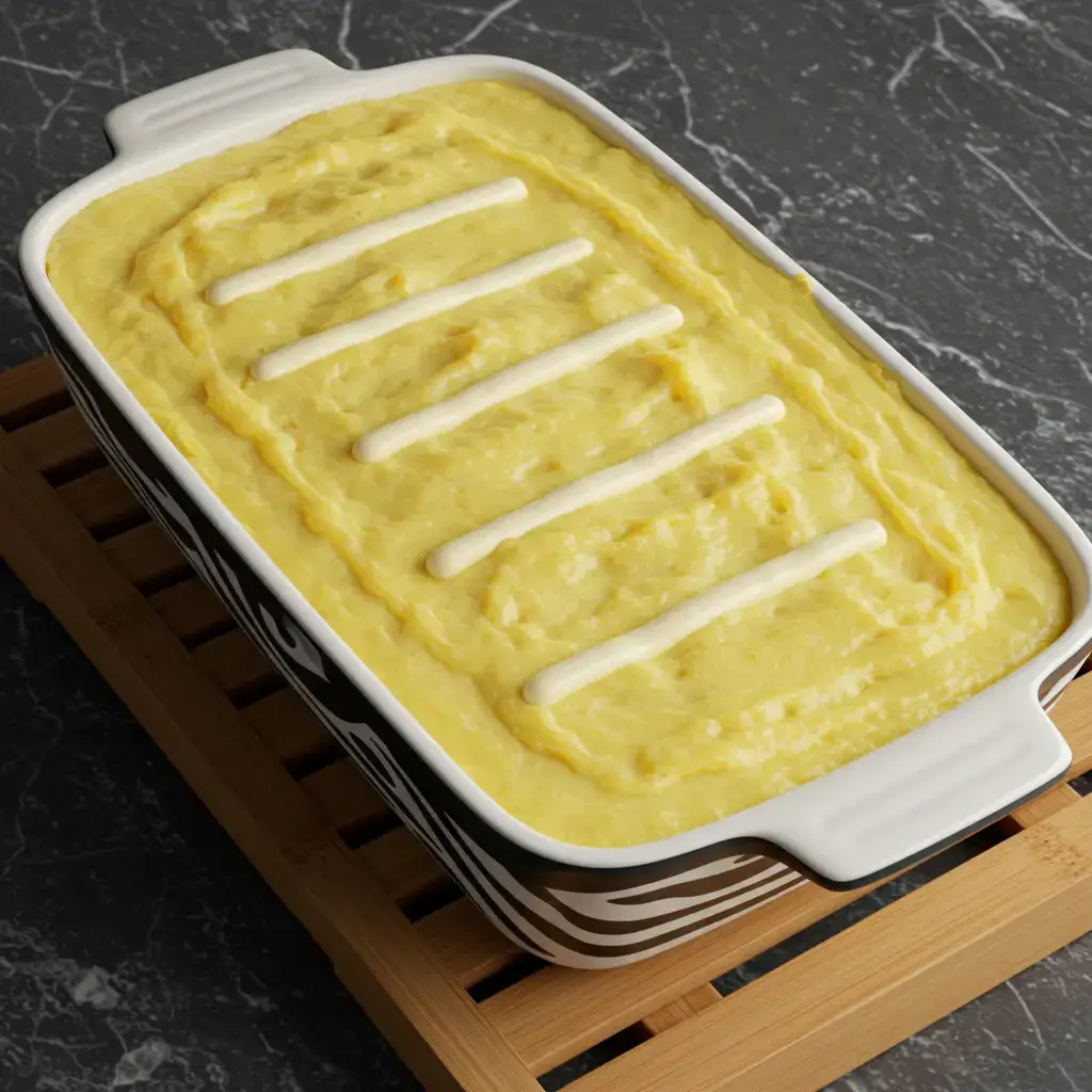 Em um refratário médio, espalhe metade do purê de batata. Cubra com o queijo prato.
