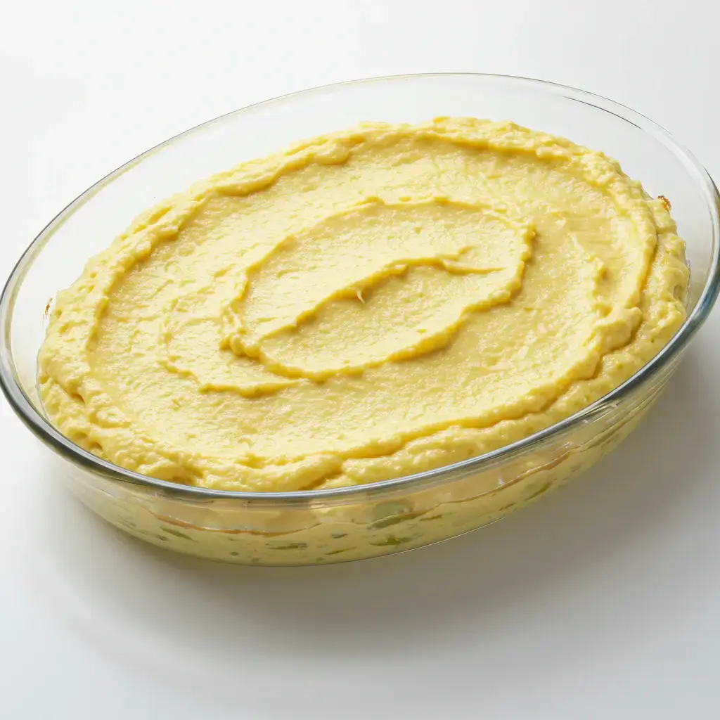 Em um refratário médio, espalhe metade do purê de batata. Sobre o purê, coloque o bacalhau refogado. Cubra com o restante do purê.