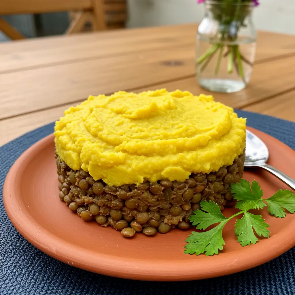 Um prato reconfortante e saboroso! Lentilha cremosa e temperada, coberta por uma macia polenta de abóbora. Uma explosão de sabores brasileiros em cada garfada.