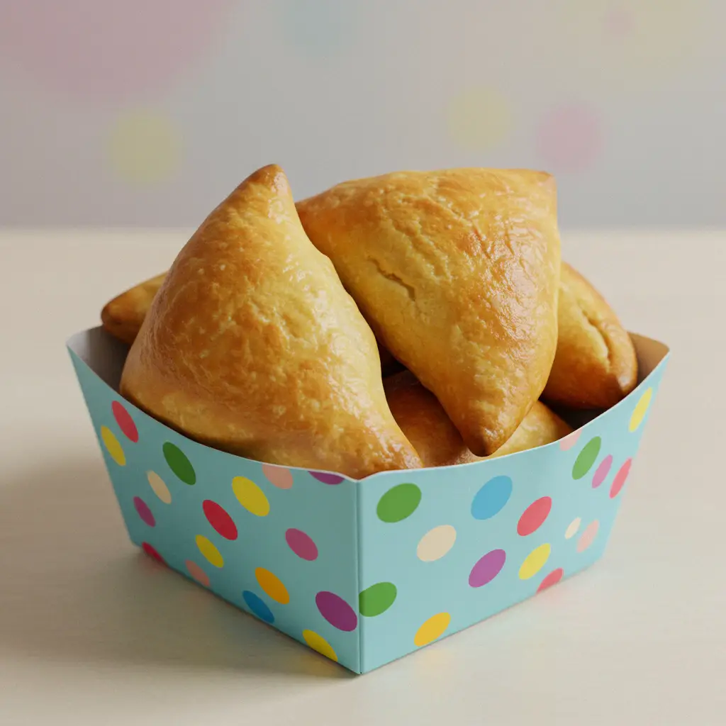 Coloque 2 colheres (chá) do recheio no centro de cada círculo, feche-o formando um triângulo e pressione as bordas para selar.