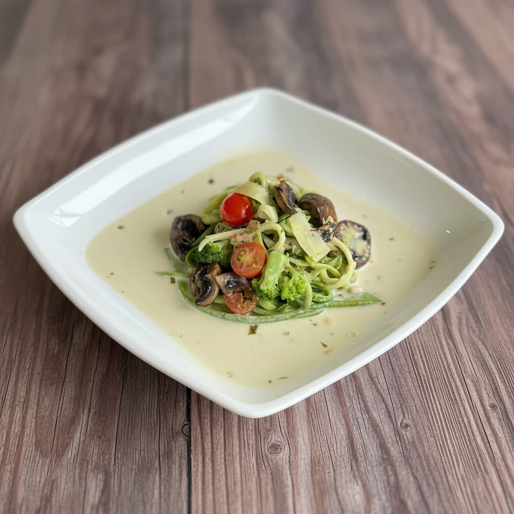 Um prato leve e saboroso, perfeito para uma refeição rápida e saudável. O espaguete de abobrinha ganha um toque cremoso com creme de leite e pesto, combinado com cogumelos e brócolis.
