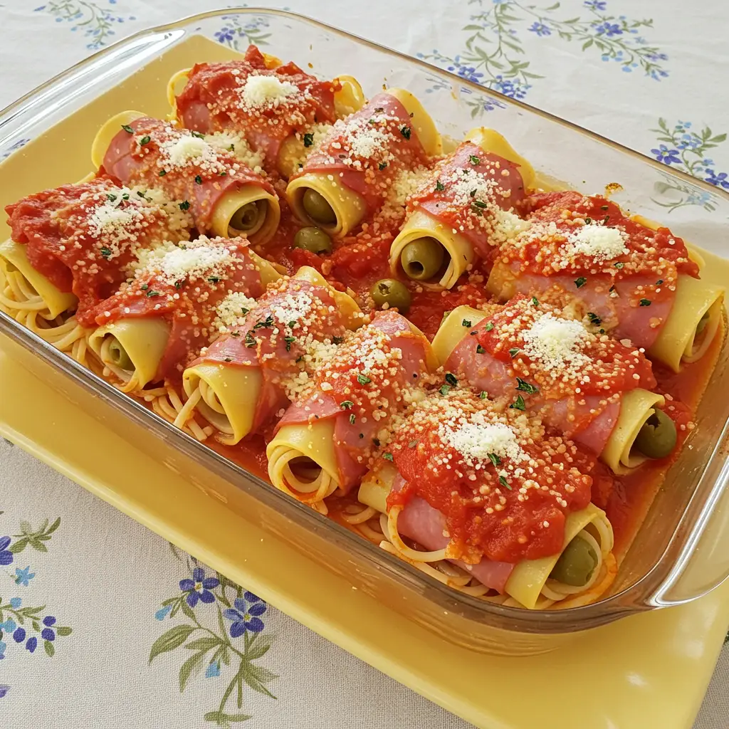Um prato divertido e saboroso! Macarrão espaguete enrolado com presunto e mussarela, coberto com molho de tomate e gratinado com queijo. Uma explosão de sabores que agrada a todos!
