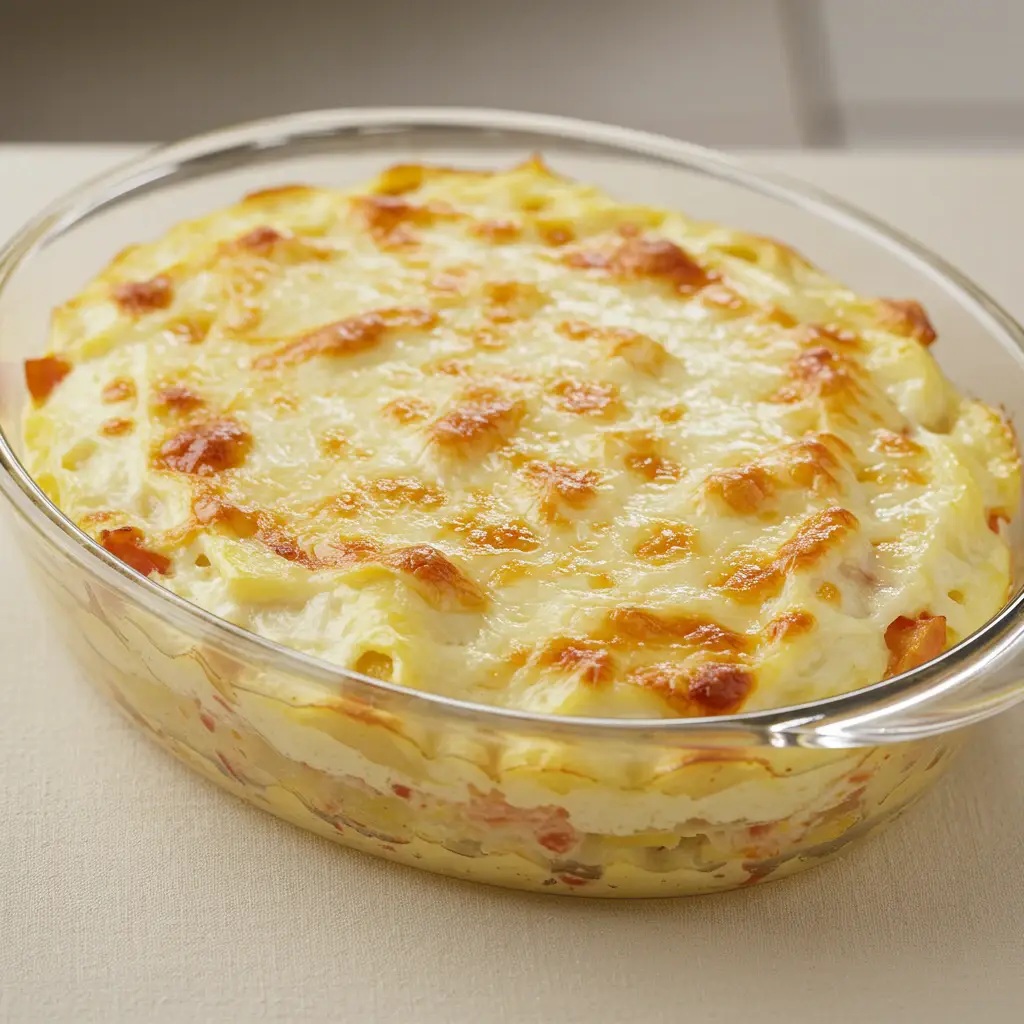 Um estrogonofe brasileiro com um toque especial! Frango suculento, milho doce e um cremoso creme de leite, gratinado com queijo e acompanhado de um delicioso purê de batatas. Uma refeição reconfortante e saborosa.