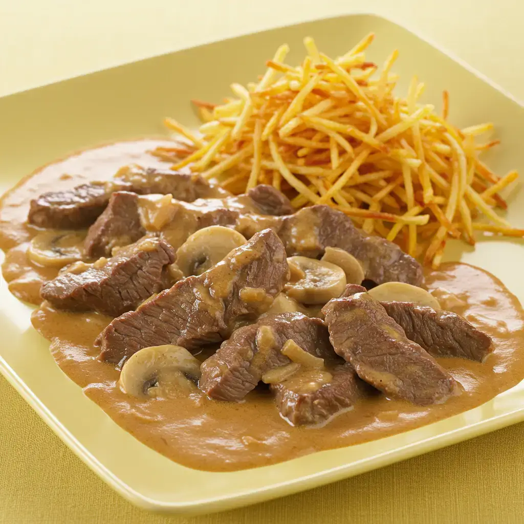 Um estrogonofe cremoso e saboroso, com carne macia e um toque especial de vinho branco. Perfeito para um jantar em família ou uma ocasião especial, acompanhado de arroz branco e batata palha.