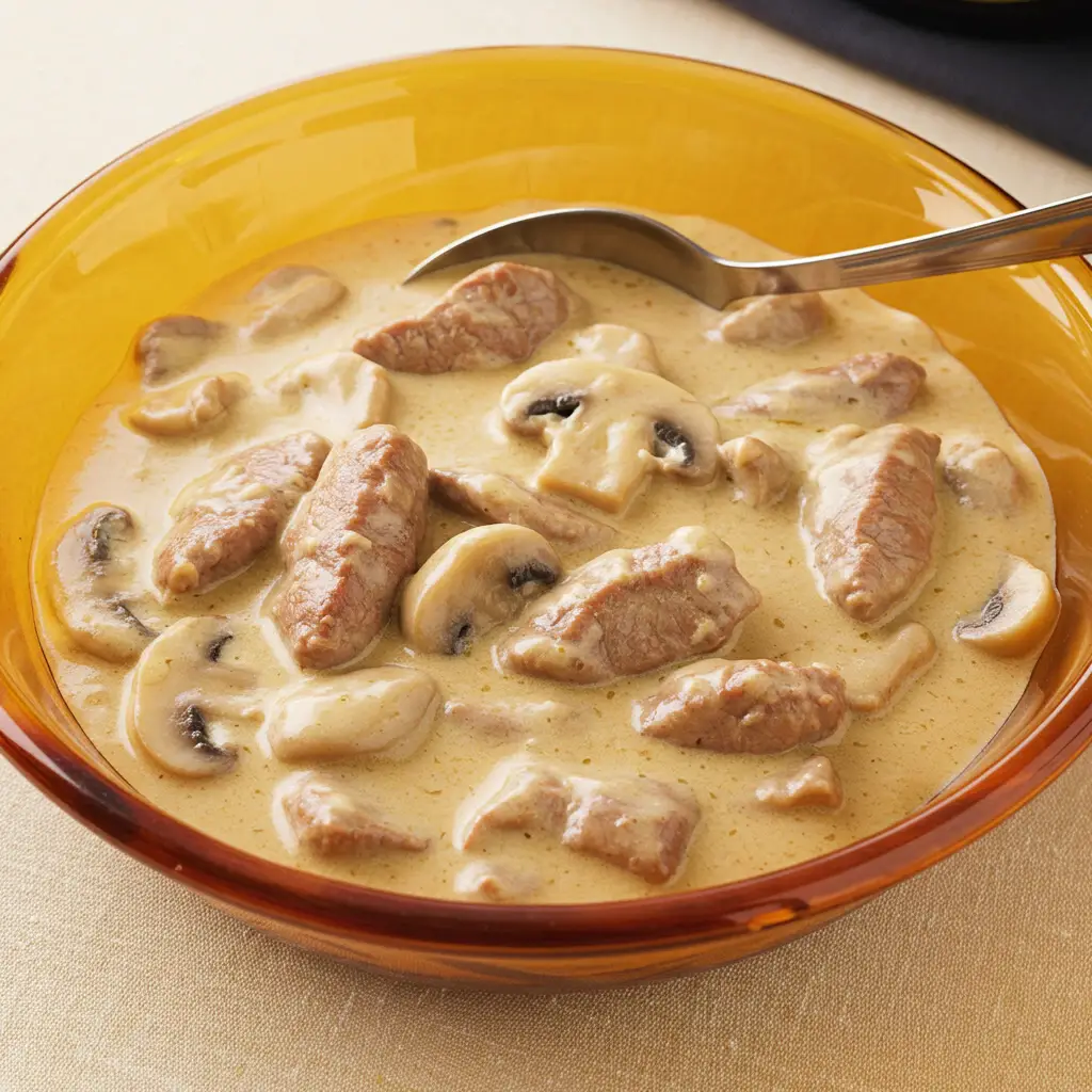 Um estrogonofe cremoso e saboroso, com carne macia e champignons frescos. Perfeito para um jantar especial, acompanhado de arroz branco, batata palha e salada verde.