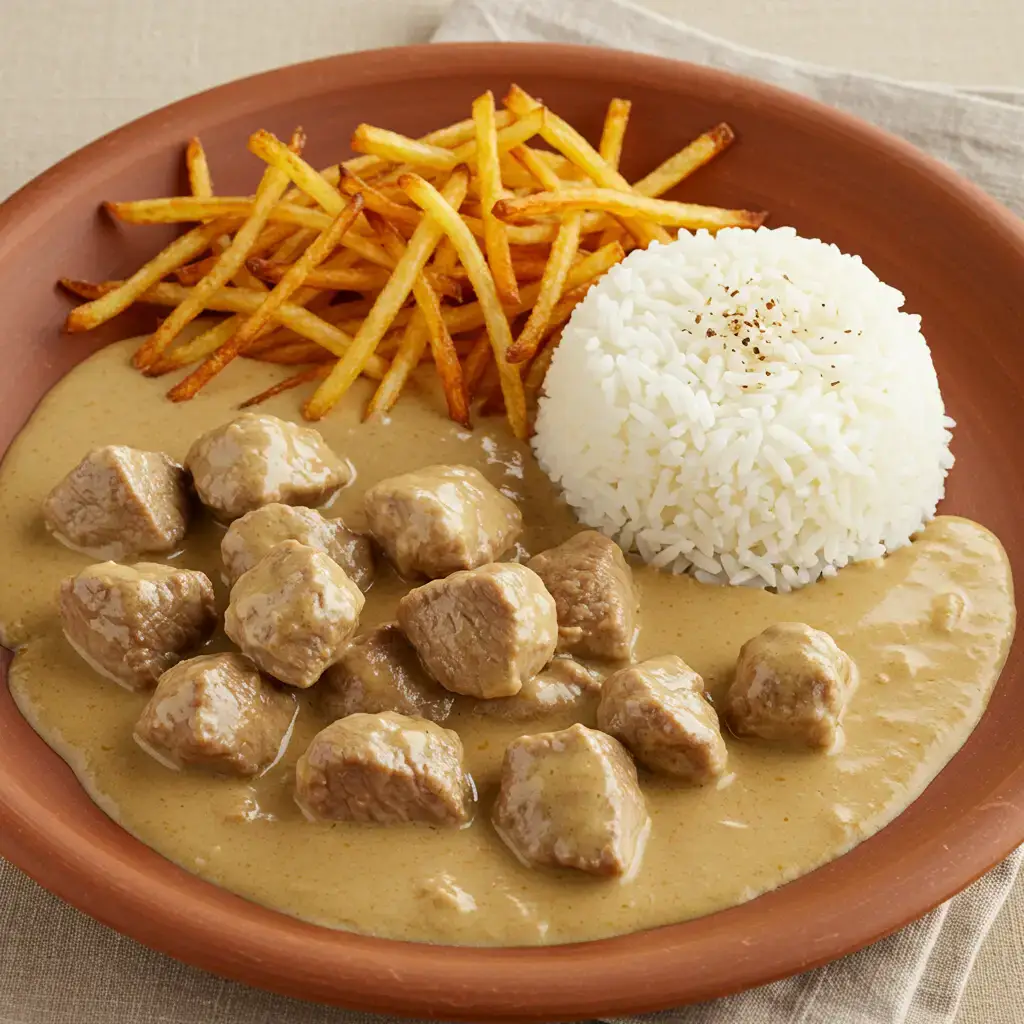 Um estrogonofe cremoso e saboroso, feito com carne macia e ingredientes frescos. Perfeito para um jantar em família ou uma refeição especial. Acompanha arroz branco e batata palha.