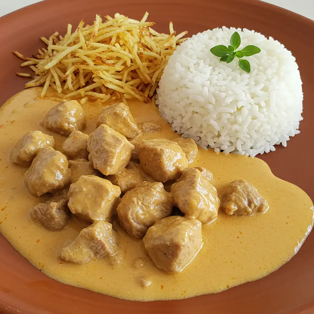 Um estrogonofe prático e saboroso, perfeito para o dia a dia. Carne macia em um molho cremoso, acompanhado de arroz e batata palha. Uma refeição completa e irresistível!
