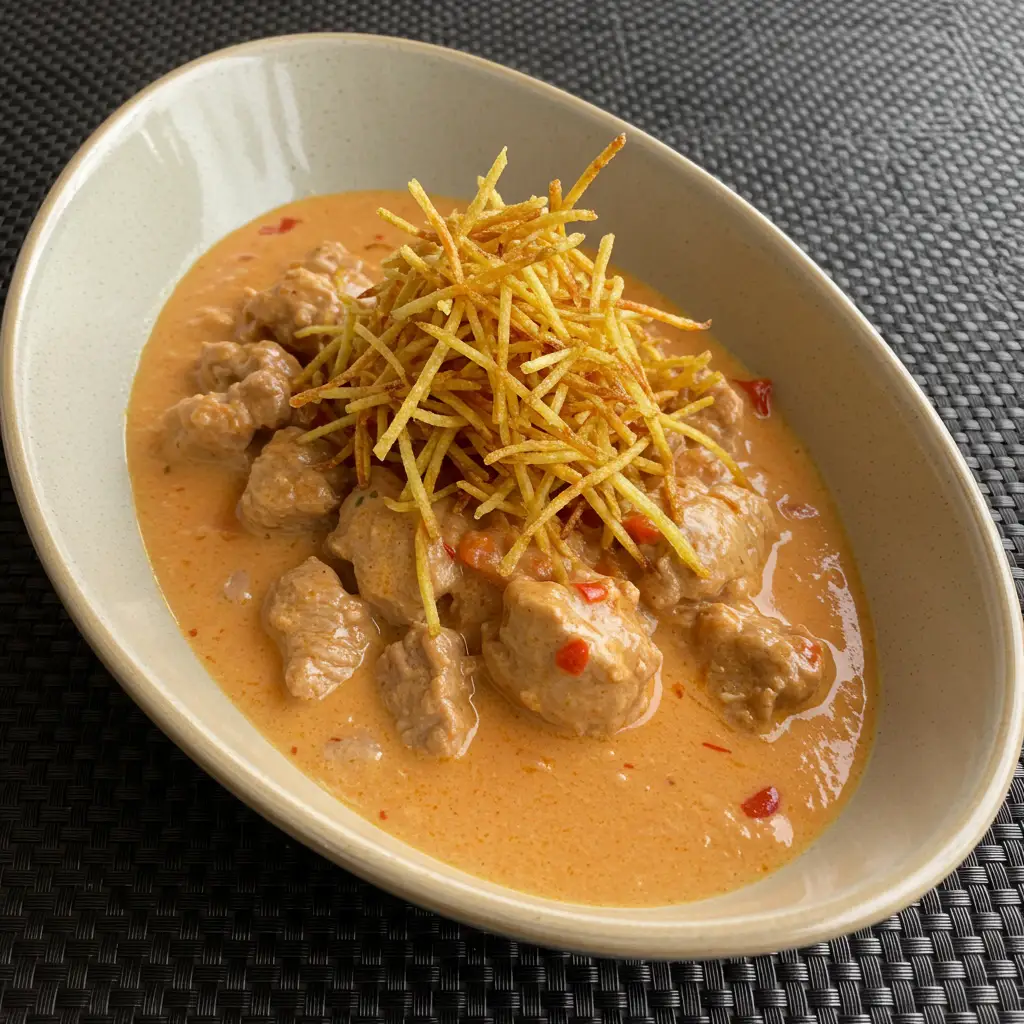 Um estrogonofe cremoso e saboroso, feito com carne macia e temperos que realçam o sabor. Perfeito para um jantar em família ou uma refeição especial. Acompanha arroz branco e batata palha.