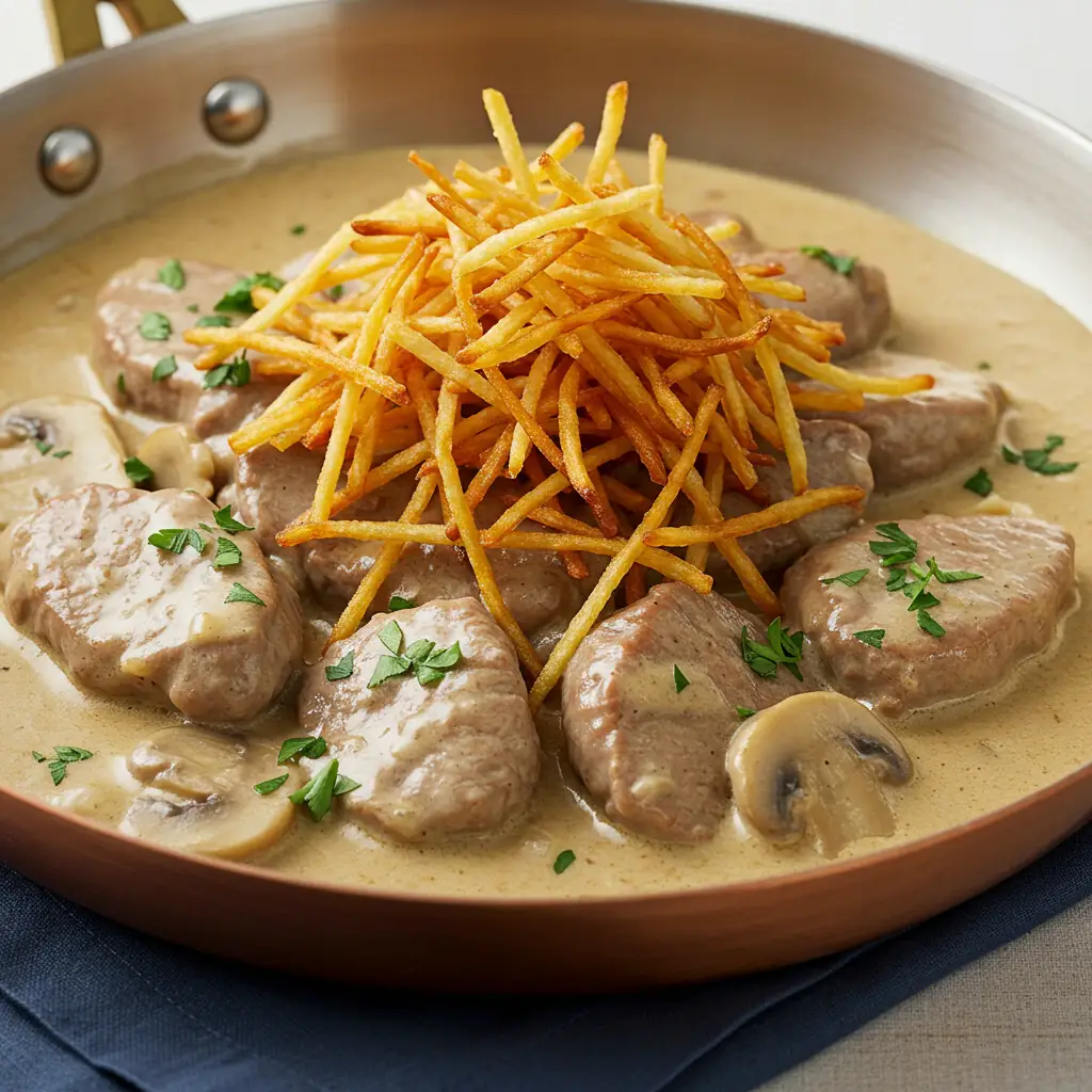 Um estrogonofe de filé mignon cremoso e saboroso, perfeito para um jantar especial. A combinação de catchup, mostarda e creme de leite resulta em um molho irresistível que acompanha muito bem arroz branco e batata palha.