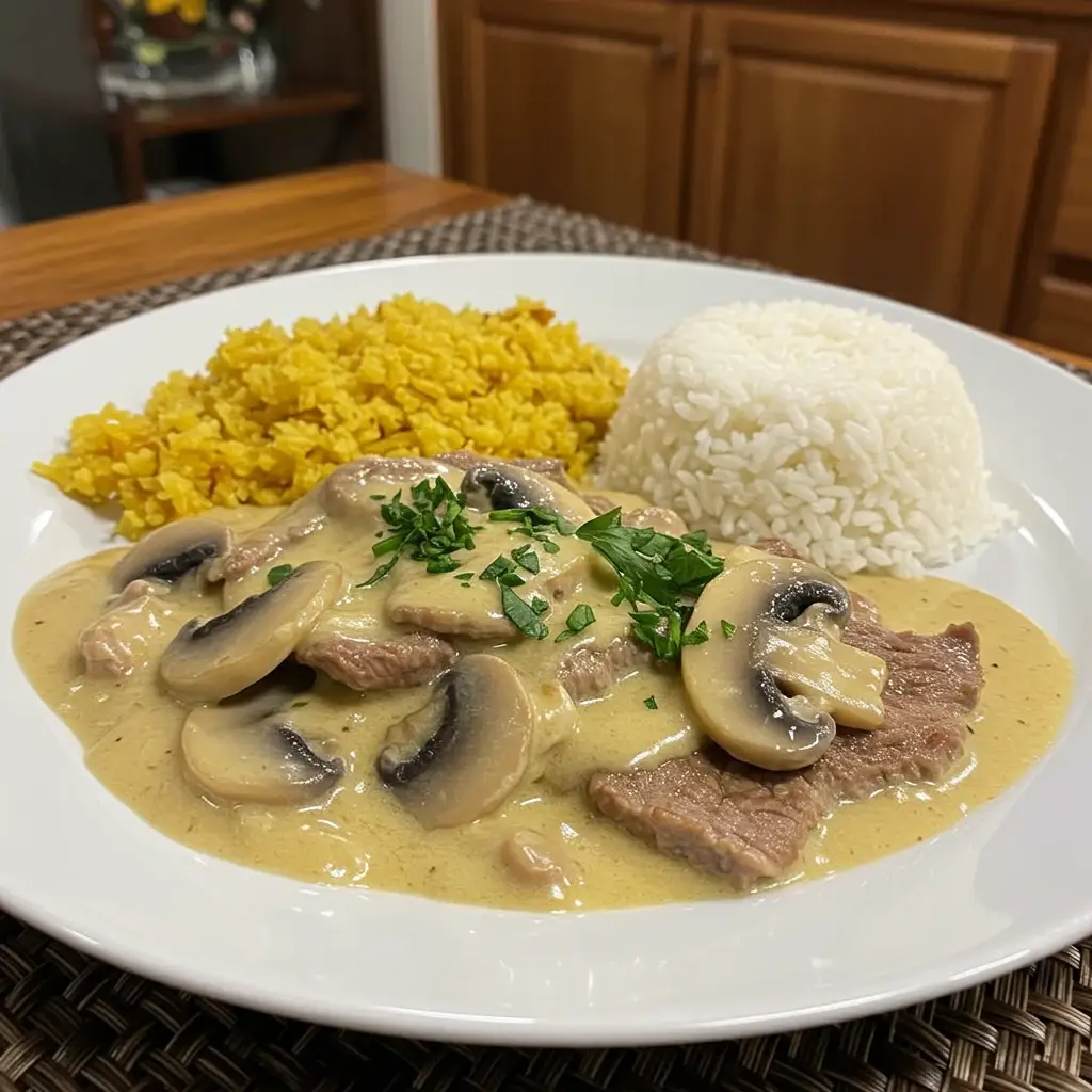 Um clássico da culinária brasileira, o estrogonofe de filé traz a combinação perfeita de carne macia e um molho cremoso, ideal para um jantar aconchegante.