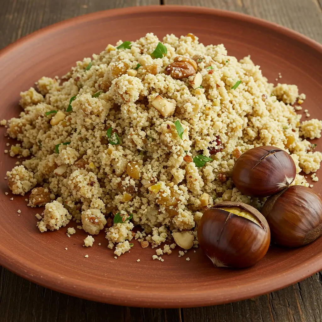 Uma farofa deliciosa e crocante, com o sabor intenso das castanhas portuguesas e o toque especial do frango. Perfeita para acompanhar carnes assadas ou um simples arroz branco.