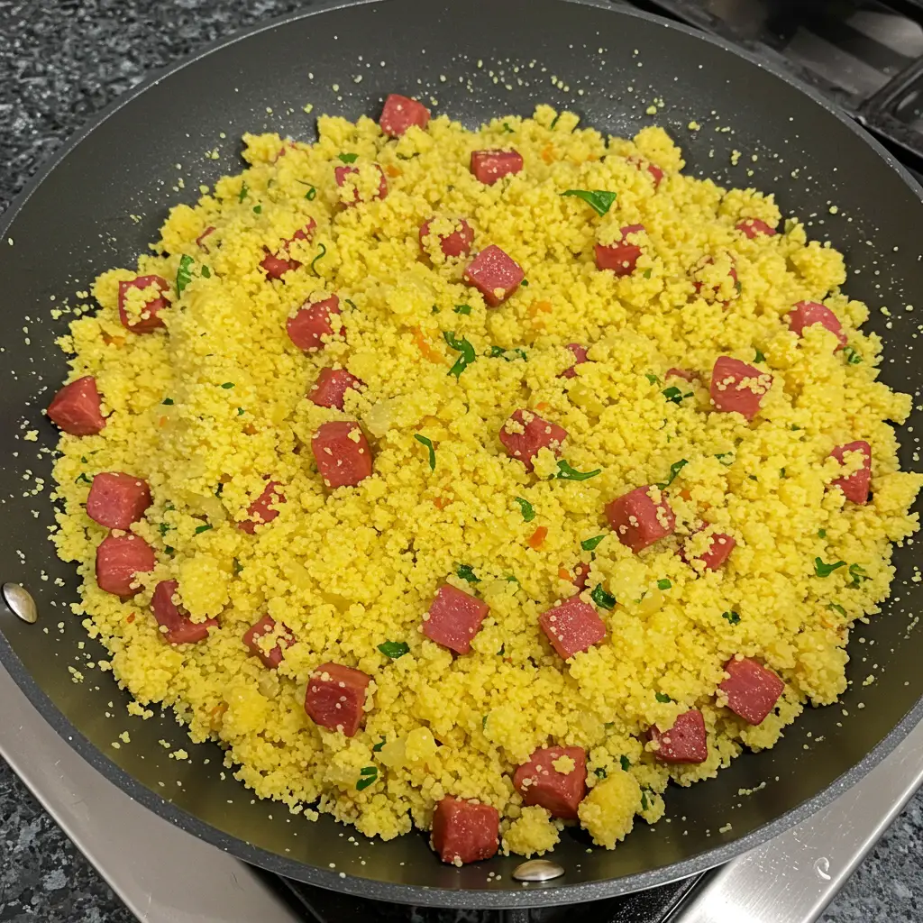 Acrescente o cuscuz cozido à panela, misturando bem para incorporar todos os ingredientes.
