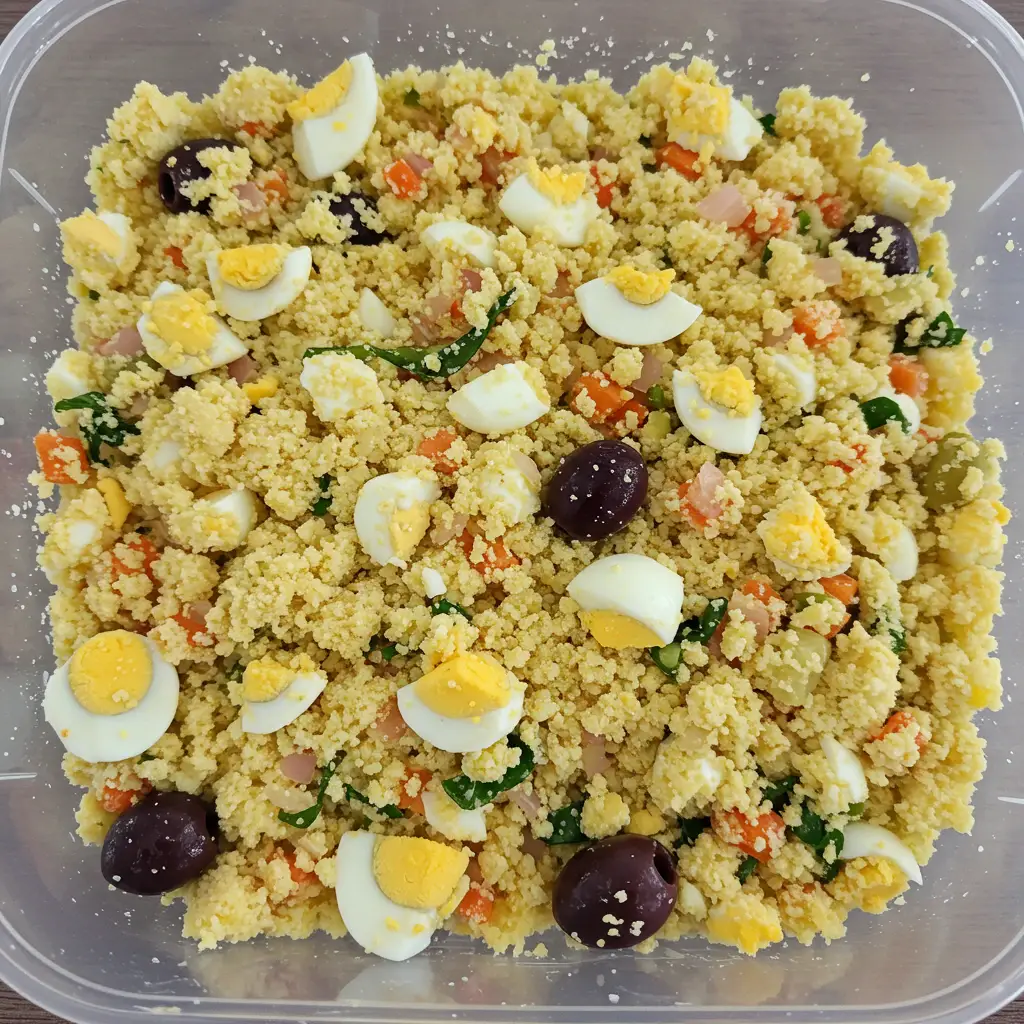 Uma farofa fria deliciosa e prática, perfeita para acompanhar churrascos ou servir como entrada. A combinação de cebola, azeitona e ovos cozidos cria um sabor único e irresistível. Ideal para um almoço leve e saboroso.