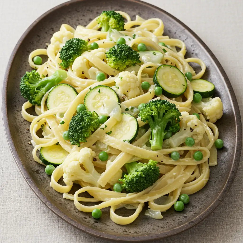 Um fettuccine leve e saboroso, com brócolis, couve-flor e abobrinha, finalizado com um cremoso molho de creme de leite e parmesão. Uma opção perfeita para uma refeição rápida e nutritiva.
