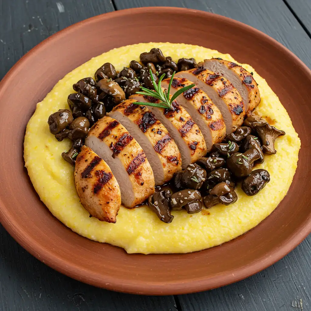 Filé de Frango ao Molho de Soja com Polenta Cremosa e Cogumelos