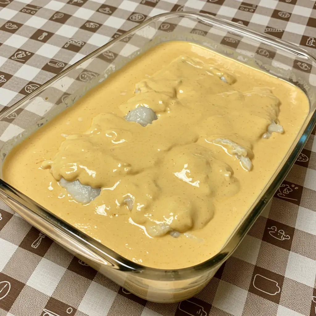 Leve ao forno preaquecido por aproximadamente 30 minutos, ou até que a merluza esteja cozida e o molho esteja cremoso.