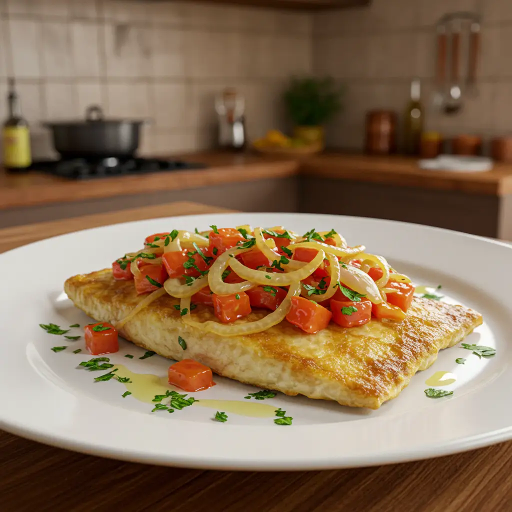 Coloque o filé de panga em uma assadeira e cubra com o refogado de cebola e tomate.