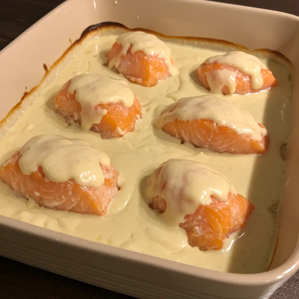 Retorne o refratário ao forno e deixe gratinar por mais 15 minutos, ou até que o peixe esteja cozido e o creme esteja dourado.