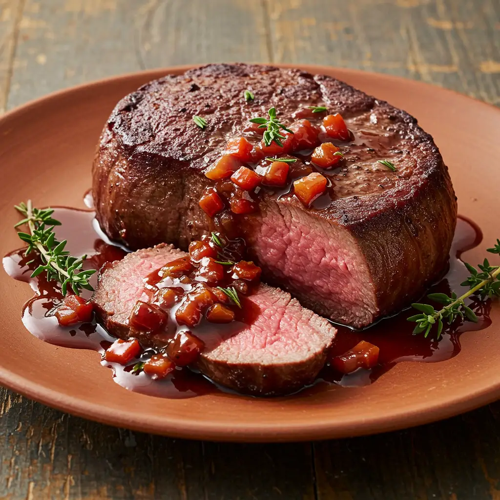 Um delicioso filé mignon grelhado, envolto em um suculento molho de vinho tinto com legumes frescos. Uma explosão de sabores que agrada a todos os paladares. Prato sofisticado e fácil de preparar.