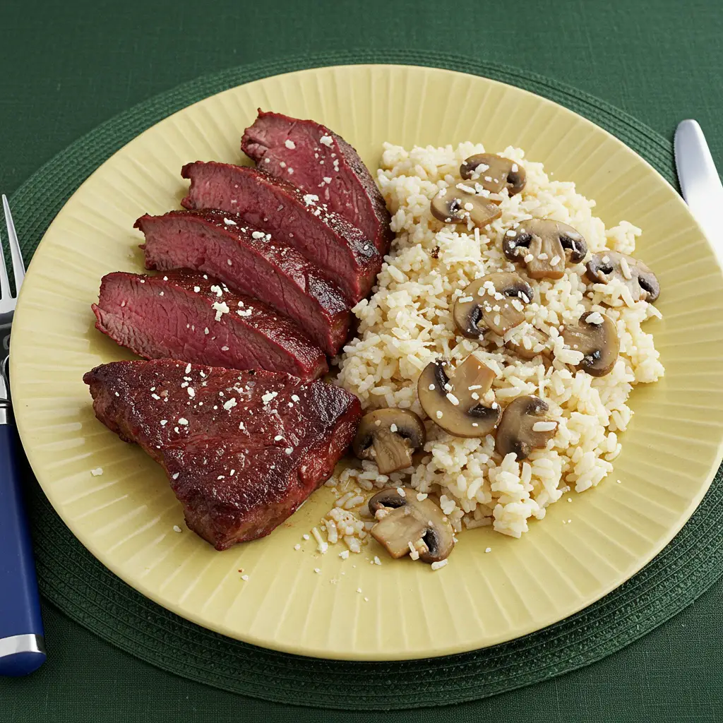 Um filé mignon suculento, marinado em vinho tinto e ervas, coberto por um delicioso molho de cogumelos e cebola. Uma experiência gastronômica inesquecível, perfeita para um jantar especial.