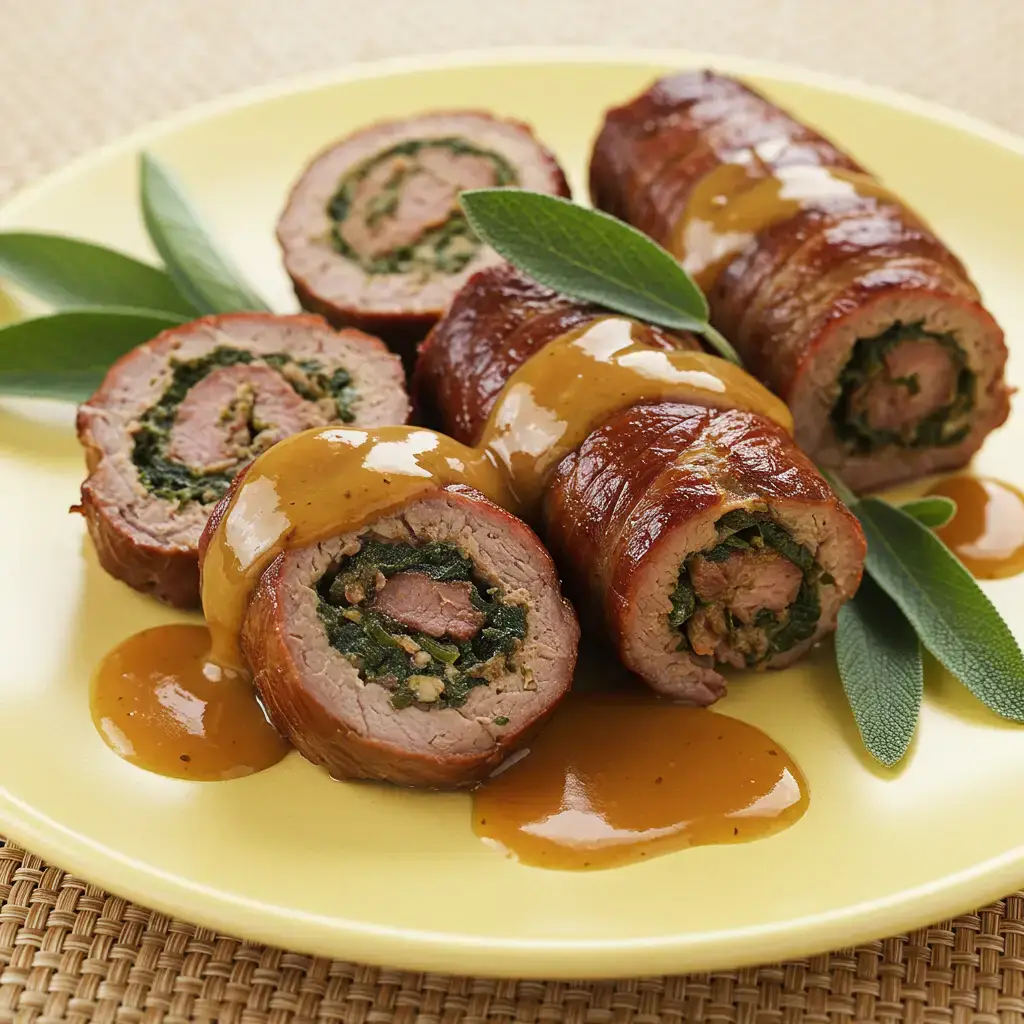Deliciosos filés mignon recheados com sálvia, envoltos em um irresistível molho de vinho tinto, finalizado com um toque cremoso de maionese de cebolas tostadas. Uma experiência gastronômica inesquecível!