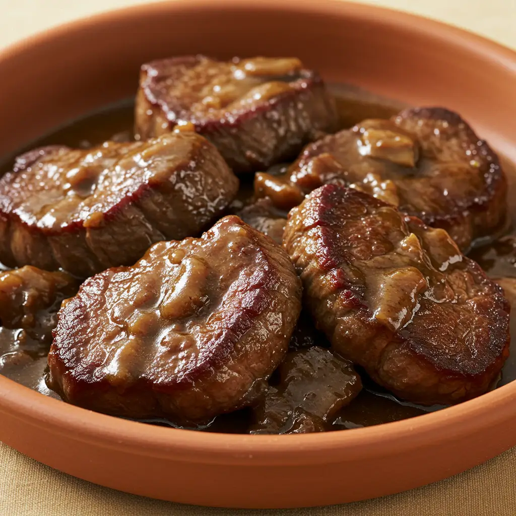 Desligue o fogo e despeje o molho sobre os bifes de filé mignon. Sirva imediatamente.