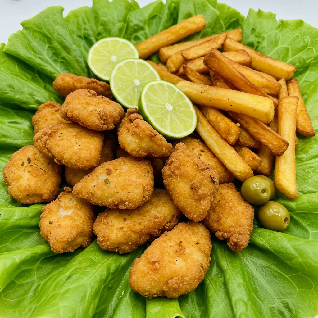 Delicioso Fish and Chips com batatas assadas crocantes e um irresistível molho caseiro. Peixe suculento empanado em uma crosta leve e saborosa. Uma refeição completa e saborosa!