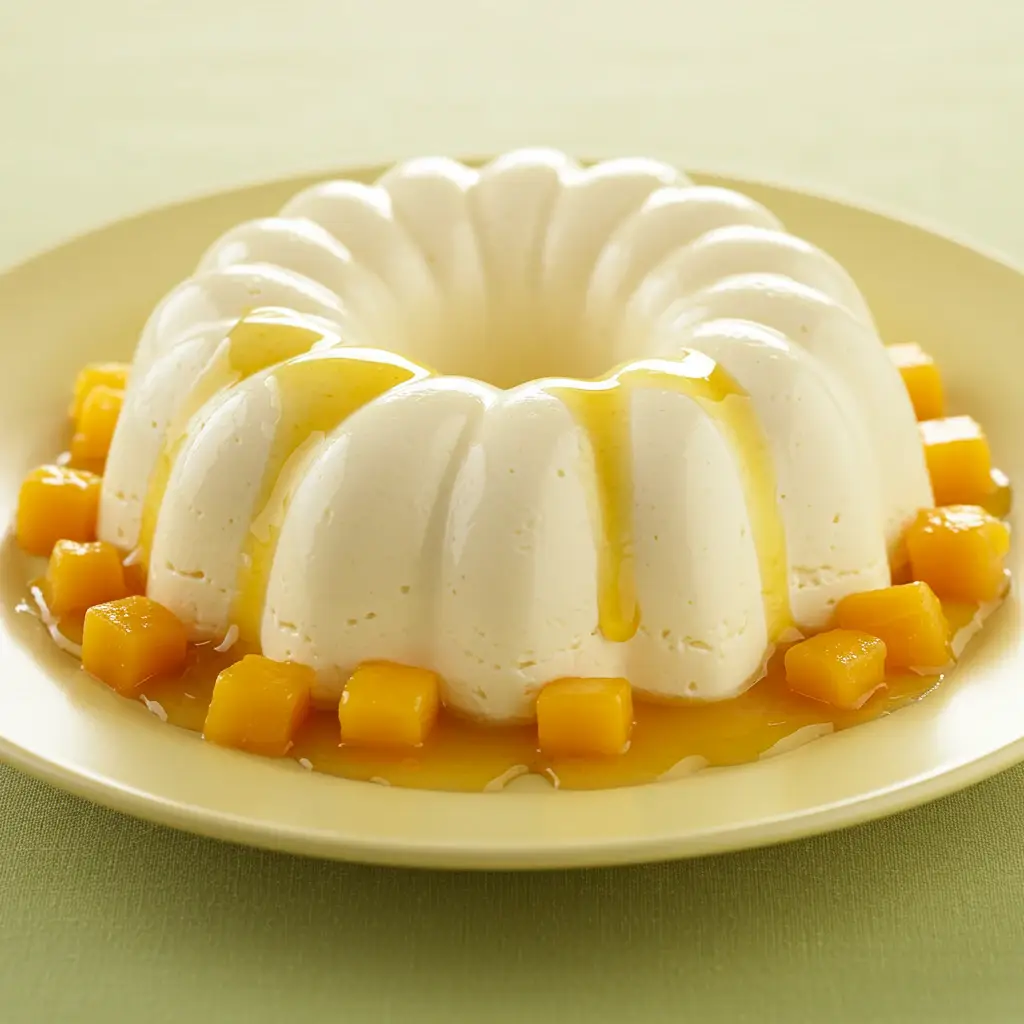 Desenforme o flan e sirva decorado com os pedaços de pêssego reservados e o purê de pêssego batido.