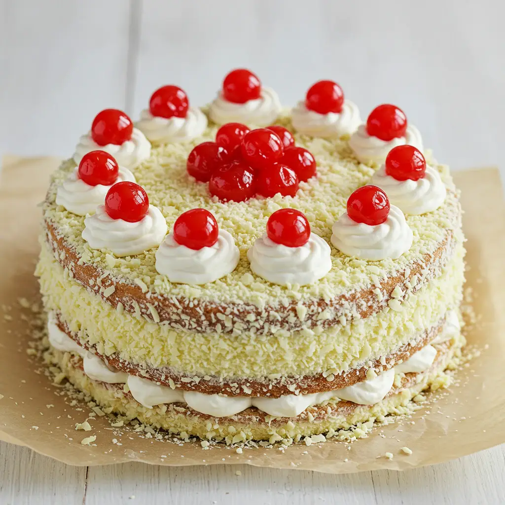 Um bolo de chocolate branco irresistível! Camadas fofas de bolo umedecido com calda de baunilha, recheio cremoso de chantilly com cerejas e cobertura generosa de chocolate branco ralado. Uma verdadeira floresta branca em cada fatia.