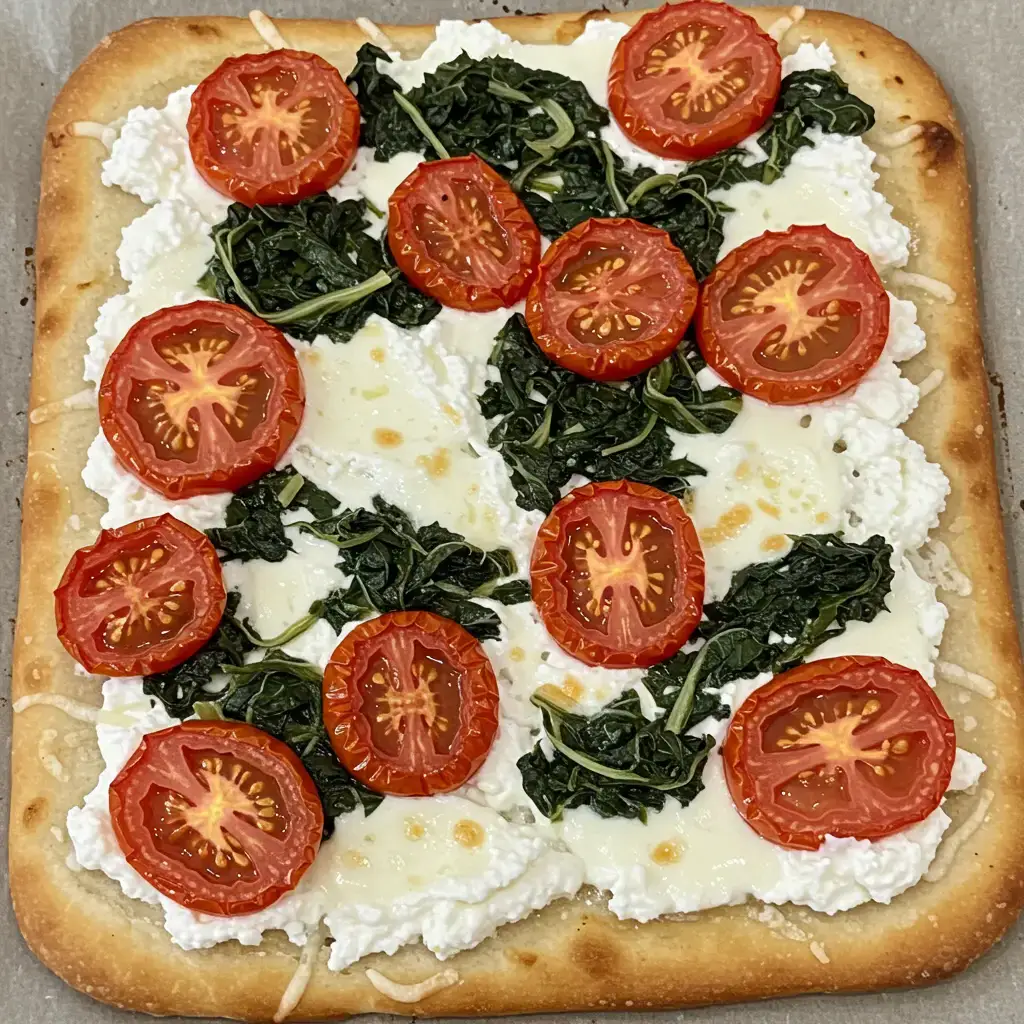 Uma focaccia crocante e aromática, coberta com escarola levemente cozida, tomates suculentos e queijo de búfala cremoso. Uma explosão de sabores que harmoniza perfeitamente o doce, o salgado e o levemente amargo.