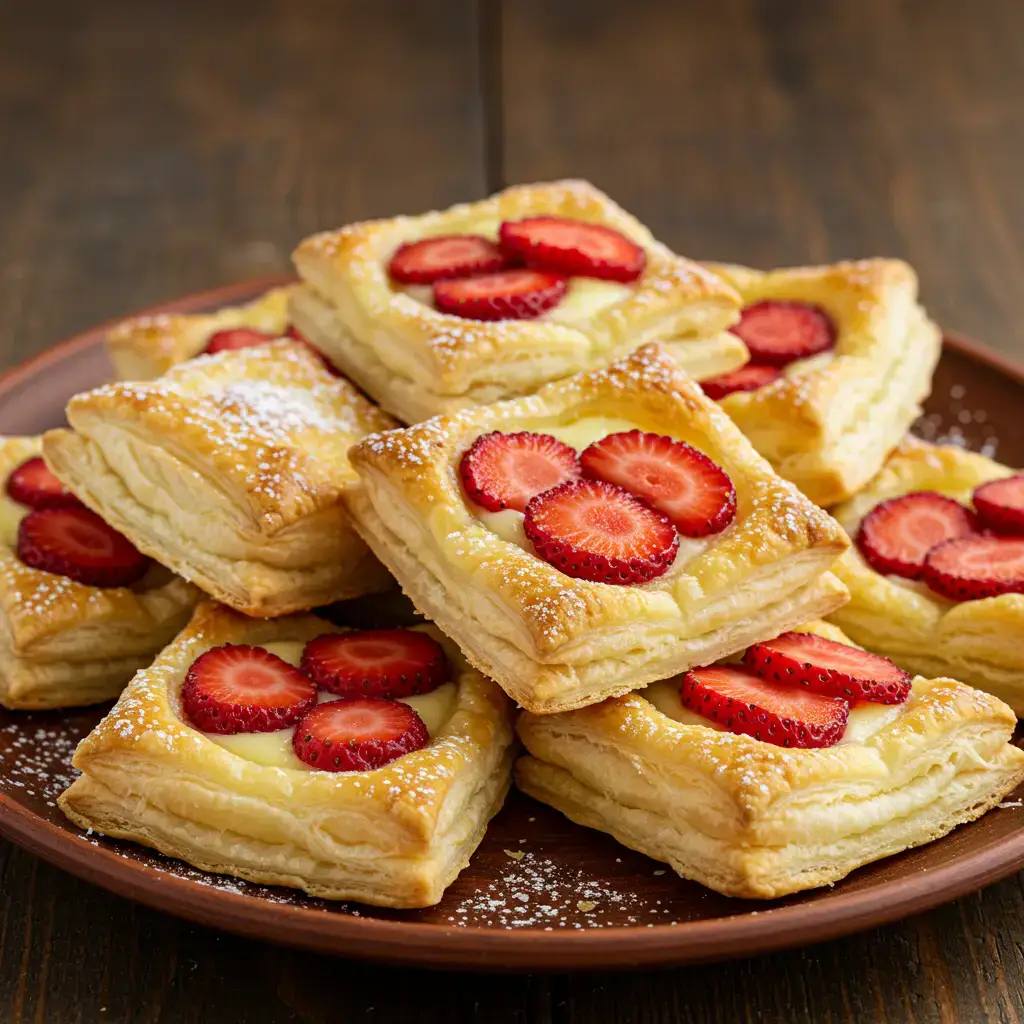 Deliciosos folhadinhos de massa pronta, recheados com um cremoso creme de baunilha e fatias suculentas de morango. Uma sobremesa fácil e elegante, perfeita para qualquer ocasião.