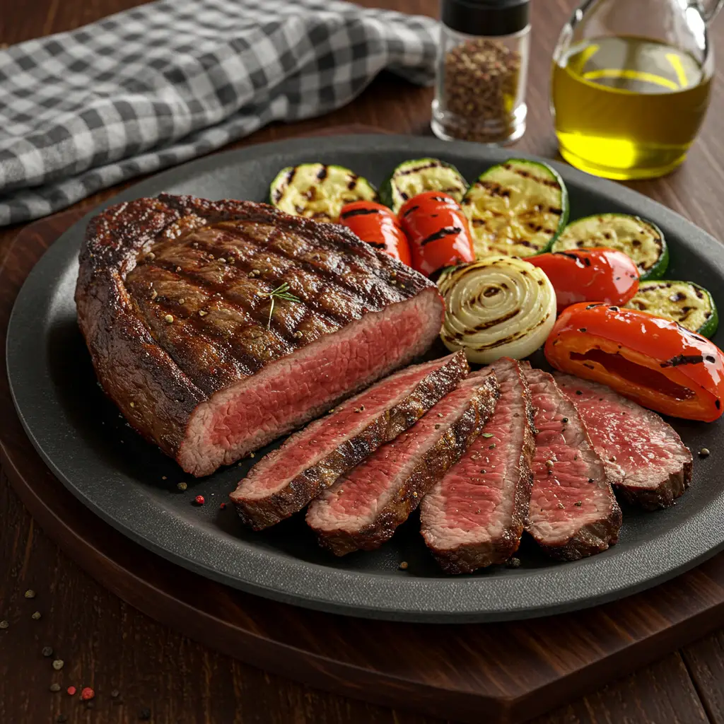 Uma fraldinha suculenta grelhada na brasa, acompanhada de legumes saborosos e um chimichurri vibrante. Uma combinação perfeita de sabores e texturas para um almoço ou jantar inesquecível.