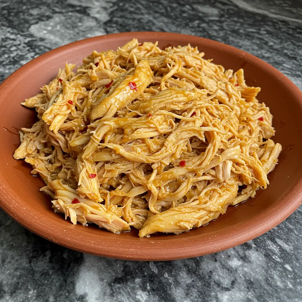 Adicione o frango desfiado ao molho e misture delicadamente. Deixe marinar por, pelo menos, 1 hora na geladeira.