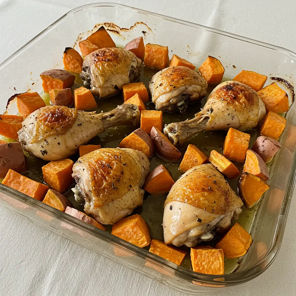 Um prato brasileiro saboroso e fácil de fazer! Frango suculento assado com batatas doces caramelizadas, temperado com ervas frescas e um toque de manteiga.