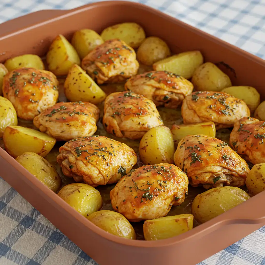 Um frango suculento e saboroso, assado com batatas macias e um molho caseiro cheio de temperos. Uma receita simples e deliciosa para o seu almoço ou jantar em família.