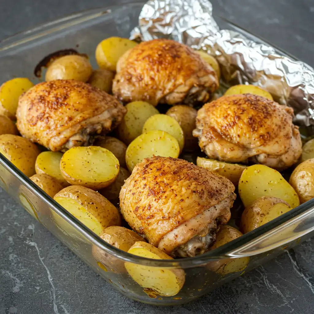 Após 45 minutos de forno, adicione as batatas ao refratário com o frango, misturando delicadamente.