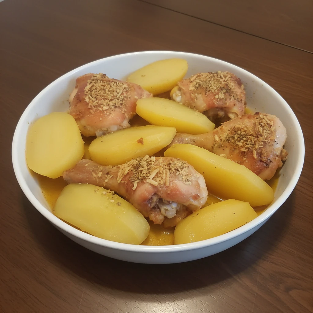 Um frango assado crocante e suculento, acompanhado de batatas macias e saborosas, gratinadas com queijo parmesão. Uma refeição completa e deliciosa, perfeita para um jantar especial.