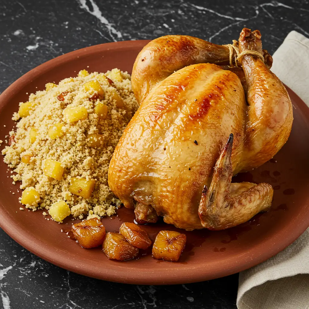 Um frango suculento assado com abacaxi, perfumado e saboroso, acompanhado de uma farofa cremosa com banana e o toque especial do abacaxi caramelado. Uma combinação perfeita de sabores e texturas para uma refeição inesquecível!