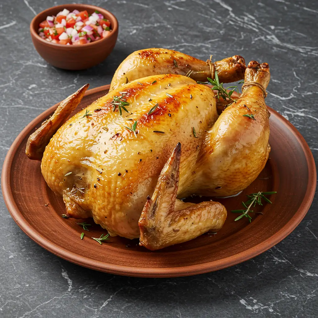 Um frango suculento assado ao forno, perfumado com ervas e acompanhado de um delicioso vinagrete de cebola e tomate. Receita simples e saborosa, perfeita para o almoço de domingo em família.